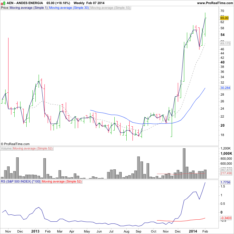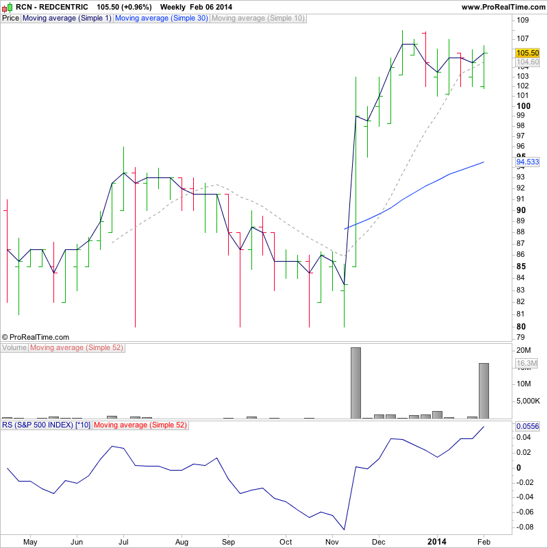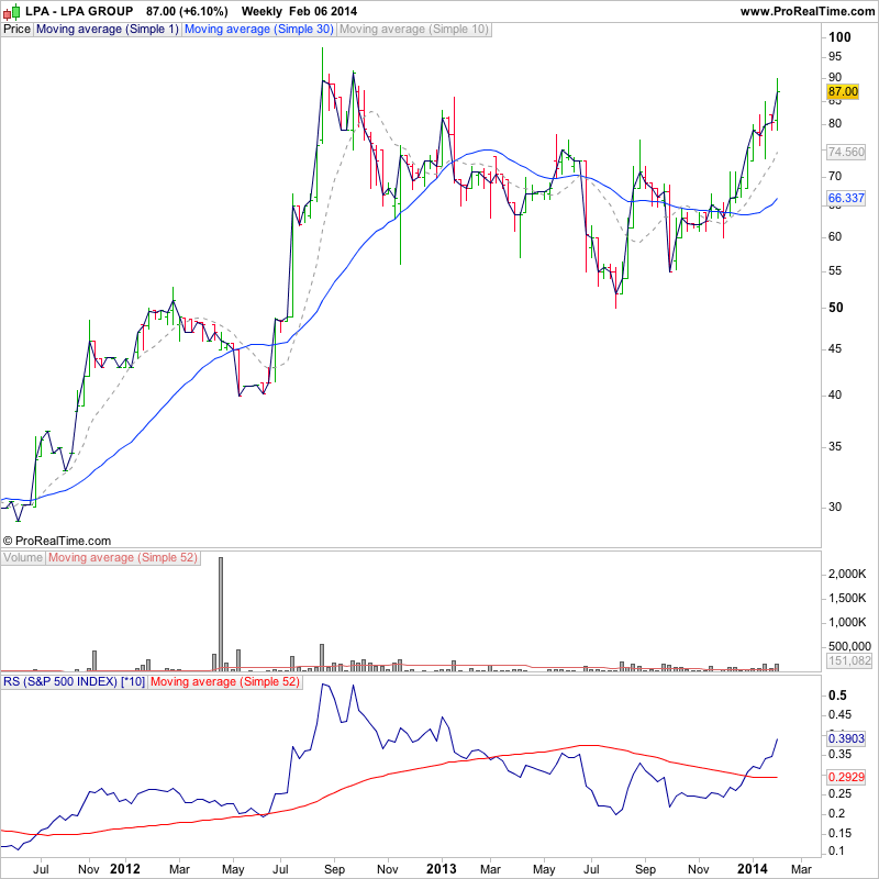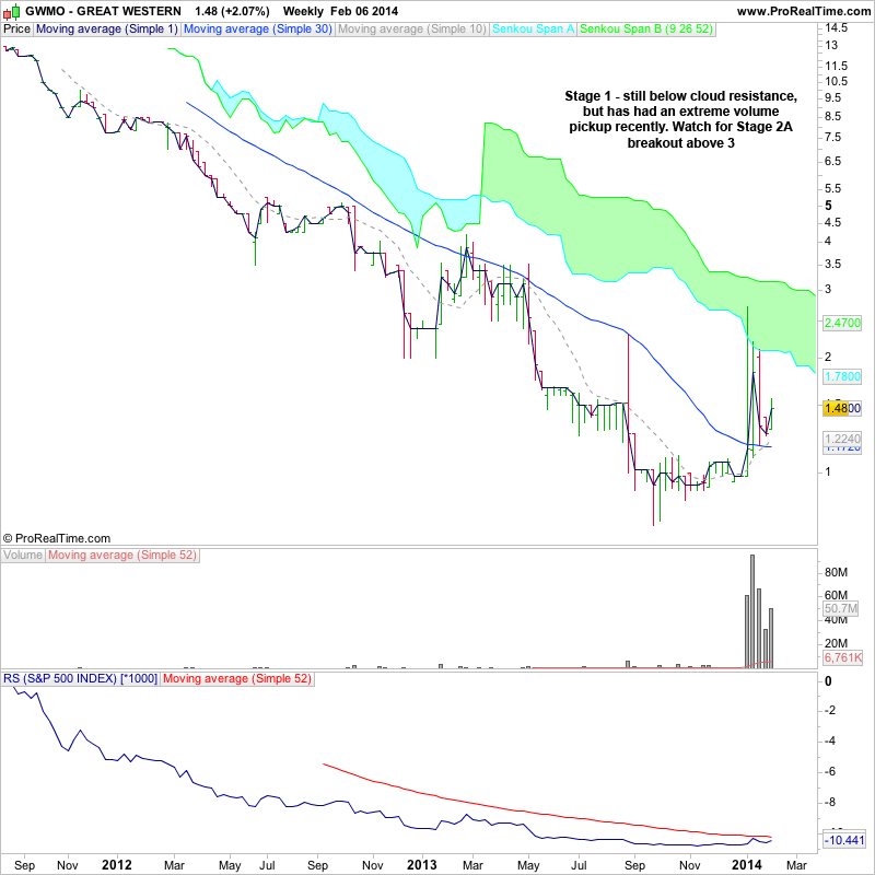 UK stocks for the watchlist form today's relative volume scans - FPO.L, RCN.L (strong volume increase today to close back above 10 week MA), STOB.L (big volume increase today following pullback to 30 week MA), RNO.L, AIP.L, WTM.L, SKP.L, LPA.L, GWMO.L (Stage 1 - still below cloud resistance, but has had an extreme volume pickup recently)