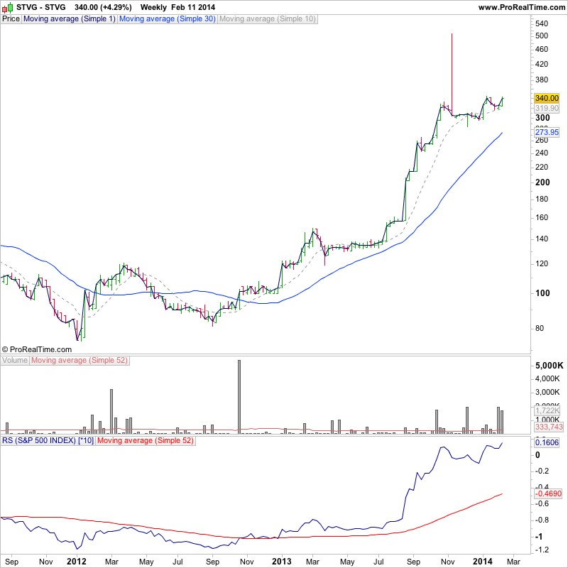 I think that we're about to have a Stage 2 breakout. The MA have moved in the right direction, the volume is certainly there now and the only thing that stops it being a breakout is the left hand lowest high at New Year 2013 and the two highs before that.