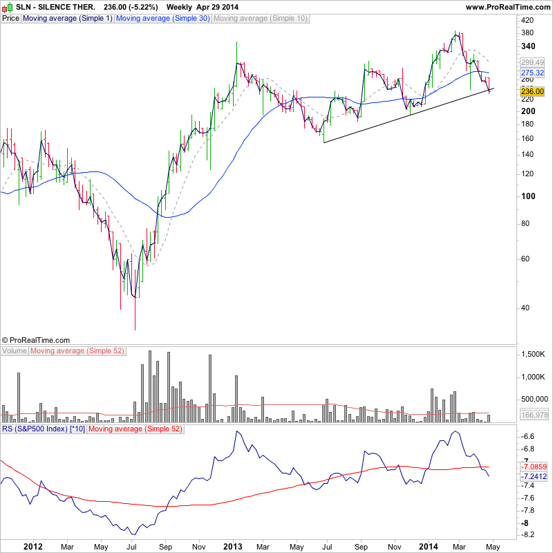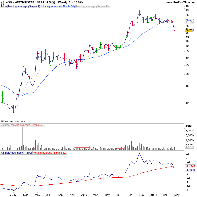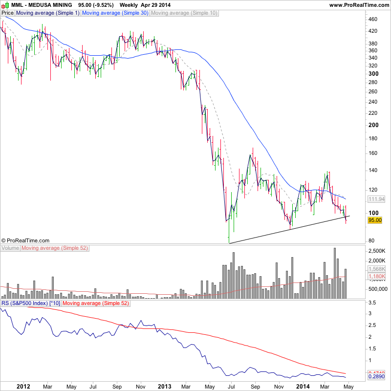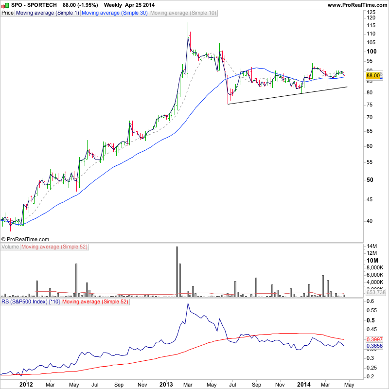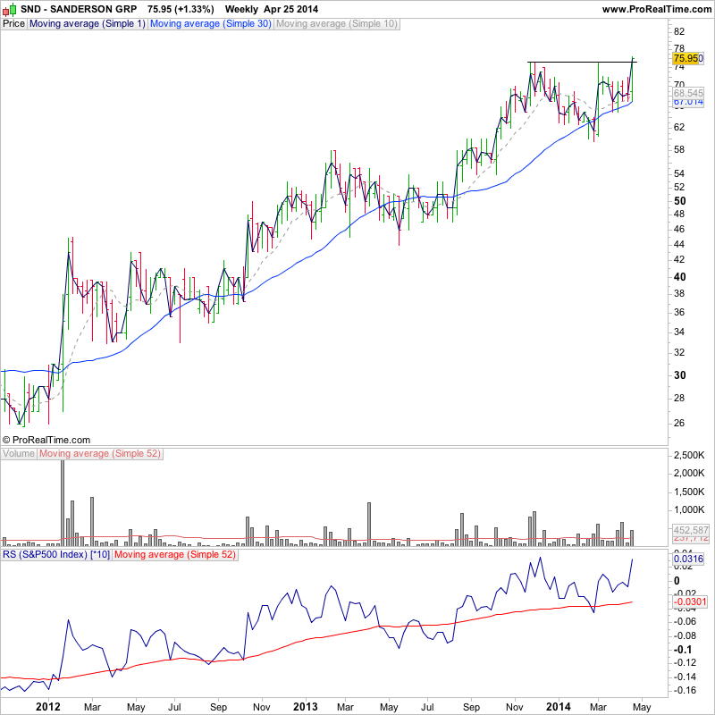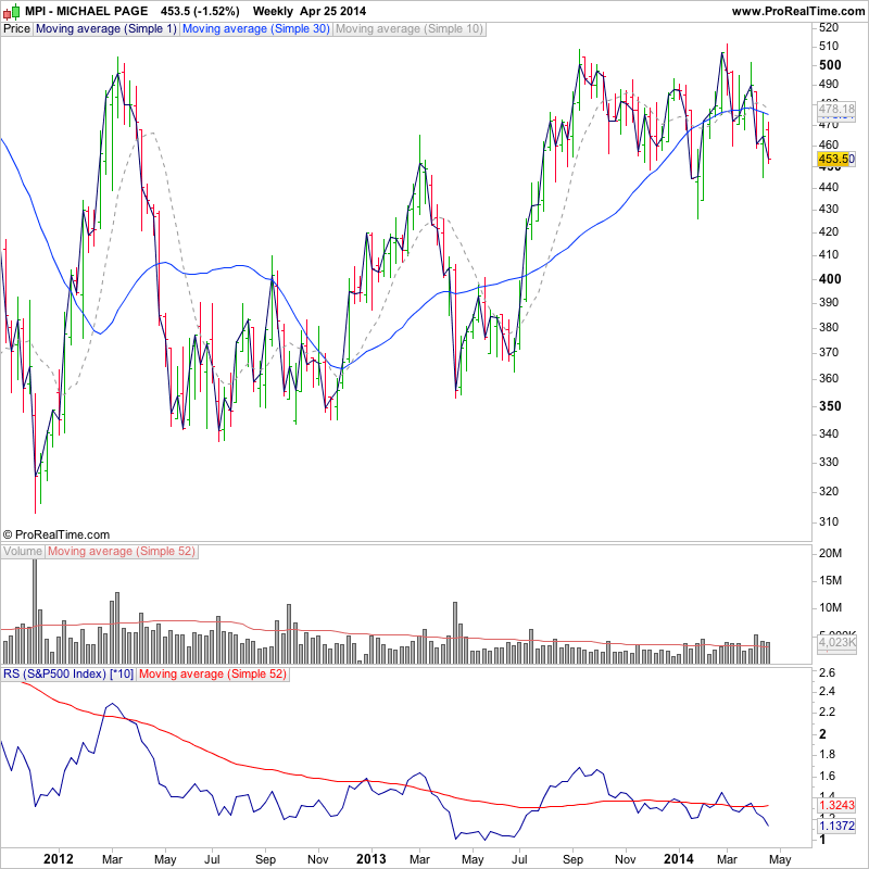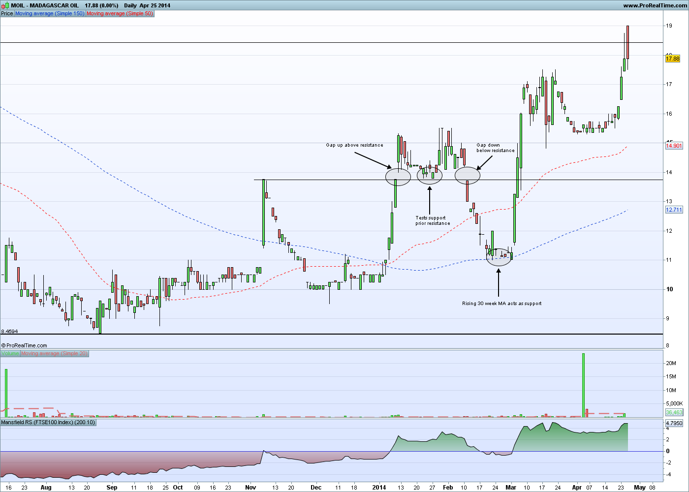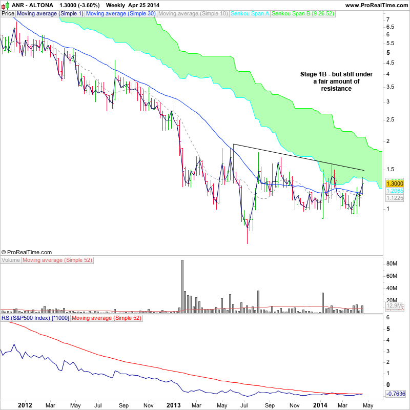 Fate does not always let you fix the tuition fee. She delivers the educational wallop and presents her own bill - Reminiscences of a Stock Operator. RE: UK Stocks - Watchlist and Discussion (Premium)(2014-04-24, 11:36 PM)isatrader Wrote:(2014-04-24, 11:07 PM)Tryst Wrote: I agree, the volume was something that I was just going to comment on. It looks like it was more volume on the decline down than there is at the base/bottom it has formed. If you look at some of the Precious metals and industrial metals miners which are forming a bottom, the volumes are quite high (possibly accumulation). Looking at the daily of MOIL it shows some technical patterns. The first break of resistance gapped up above resistance (Bullish) but it formed a balance area here and then gapped down below support and the price then moved down to touch the 30 week MA before making its next leg up - the rising 30 week MA means it made a higher low. indicative of a highly likelihood of a change in trend in this instance. A question: In stage analysis, re. support, what is the general rule of thumb? Are horizontal support lines the first lines of support with the 10 week MA being the next, followed by the 30 week MA, with the 40 week being the last chance saloon for support in stage 2, possible stage 3? RE: UK Stocks - Watchlist and Discussion (Premium)(2014-04-27, 05:14 PM)Tryst Wrote: A question: In stage analysis, re. support, what is the general rule of thumb? Are horizontal support lines the first lines of support with the 10 week MA being the next, followed by the 30 week MA, with the 40 week being the last chance saloon for support in stage 2, possible stage 3? There are no specific rules from the book on this other than horizontal trend lines with multiple touch points are more significant than angled trend lines etc. As for the various moving averages, their support and resistance strength is debatable as some people say they have no significance and others say they they do have significance because of the numerous traders that watch them and like to buy around them. So if you go with the theory that some traders like to buy around the major moving averages, then they will offer some form of support. But imo, it's definitely secondary to any previous price action support like previous swing highs and lows, especially ones that were tested multiple times before they broke. The order with which you've put them is logical, and yes, generally if a stock is below a rising or flattening 30 week MA and then testing the rising 200 day MA, it very likely to be in Stage 3.