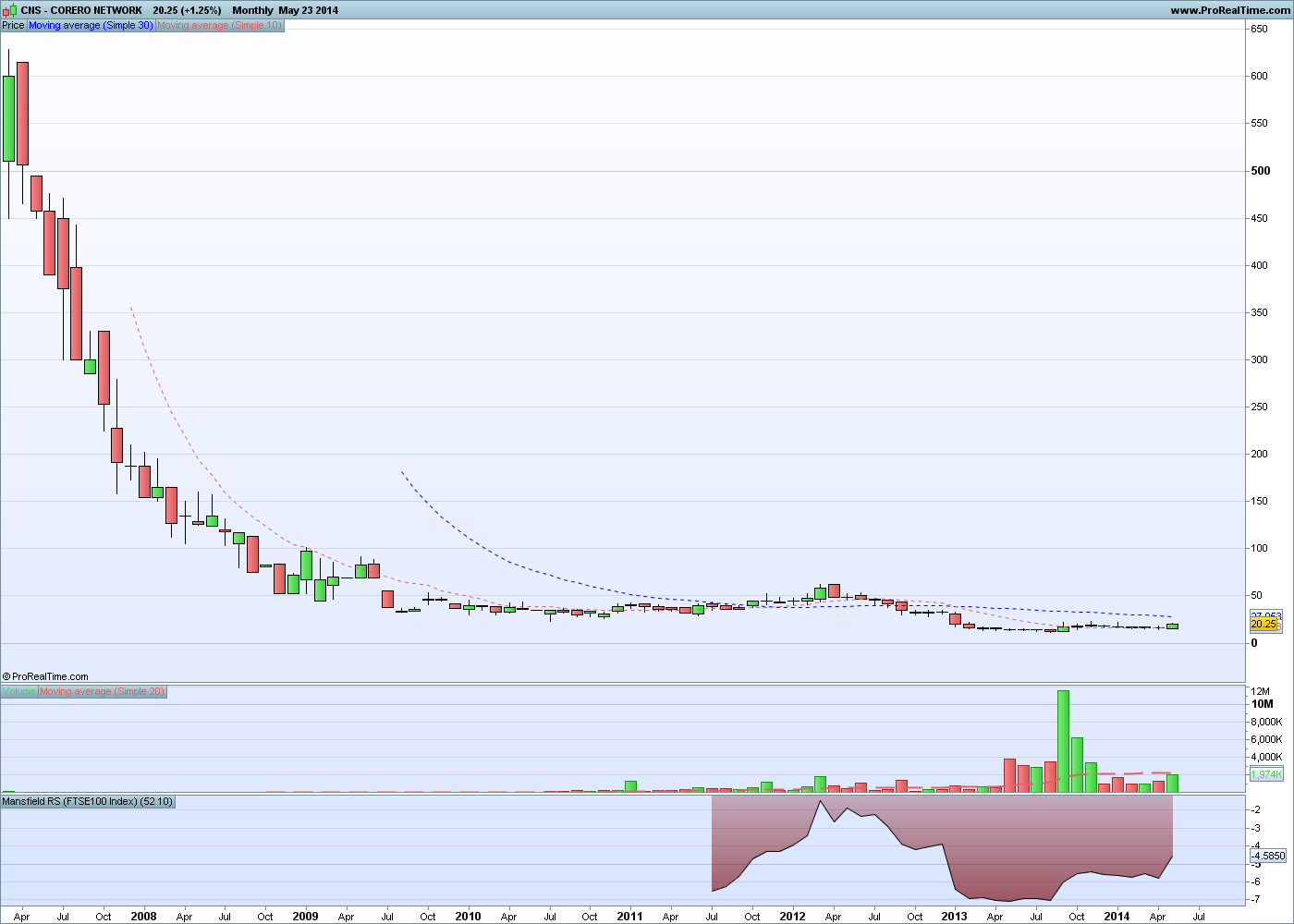 Fate does not always let you fix the tuition fee. She delivers the educational wallop and presents her own bill - Reminiscences of a Stock Operator. RE: UK Stocks - Watchlist and Discussion (Premium)(2014-05-20, 09:07 AM)isatrader Wrote: For the UK watchlist from Mondays scans - OPG.L, HGM.L (Stage 1), NTBR.L, ROSE.L, GAH.L I got a bit lucky with NTBR this week. I entered a trade in a not so good position three weeks ago, and so was stuck at a price of 32.9. Chart was still bullish although the 50 day MA was broken, so I held. Then they had a strong trading update which altered the share price fundamentally (re-introduction of the dividend etc). It had a nice gap up on the Monday open and hasn't looked back. (i'm spec'in up a PR screener for these types of gaps as I do see them quite a lot) RE: UK Stocks - Watchlist and Discussion (Premium)CNS.L - Stage 1B, working through it's resistance after a deep Stage 4 decline. Volume dried up nicely during the Stage 1 base and picked up again this week as it moves towards the top of the Stage 1 range again. Relative performance has also flattened out over the last six months or so and is now above a newly rising zero line. So a potential move into Stage 2A if it can close above 23p area imo, and hence a bit of work to do still.
