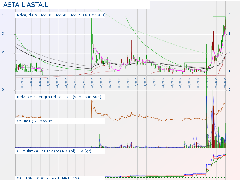 Hmm. Something odd is going on. Yahoo! finance states that the symbol has changed, ASTA.L is now MXO.L. MXO.L has 5 days of data only and it does not appear to tie up with the chart I plotted.