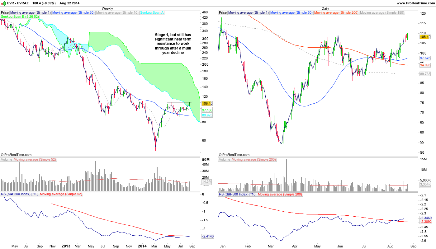 I think the scoring towards this sector may be a bit skewed if it only factoring in two equities. EVR is looking like shaping up a nice stage 1 base. It could potentially form a inverted H&S pattern on the weekly or a cup with a handle pattern on the daily chart.