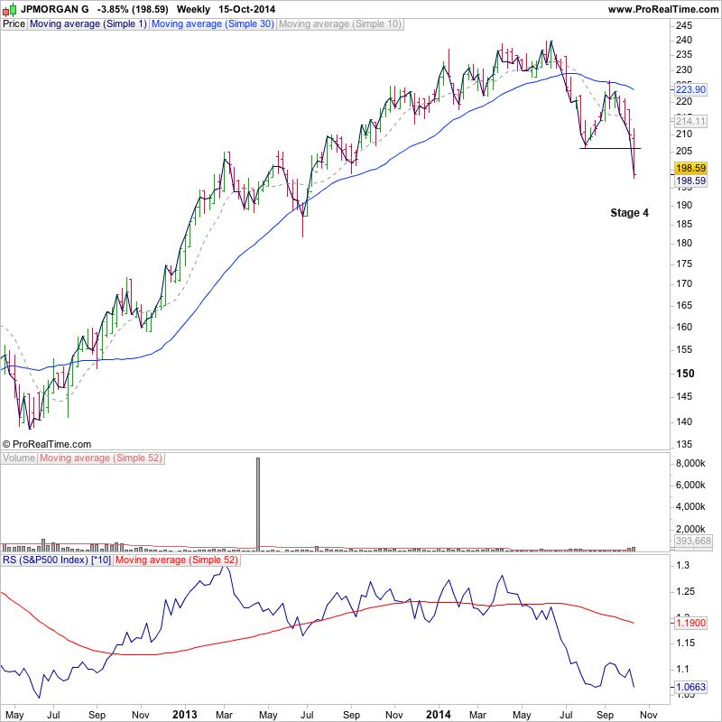 You have missed the ideal entry, as it would have been on the 26th Sept 14 imo, at the close of 620.5, as that's when it made a strong weekly breakdown that also cleared the late 2013 range resistance, and also completed a one year head and shoulders pattern. There was an earlier breakdown attempt back in late July, however it didn't clear resistance and immediately reversed and so would be discounted. Note how the volume contracted significantly on the right shoulder as it moved back higher towards the 200 day MA and then stalled without being able to recover the 200 day MA, and then as it rolled over the volume began to build again on the down weeks.