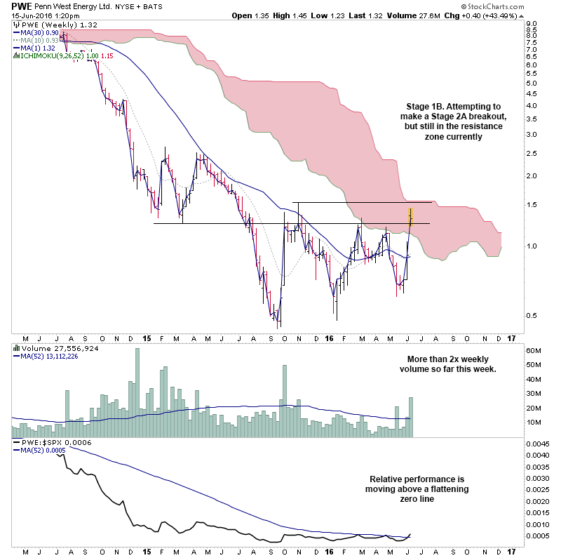 PWE - Stage 1B. Attempting to make a Stage 2A breakout, but still in the resistance zone currently, with more than 2x weekly volume so far this week, and relative performance is moving above a flattening zero line.
