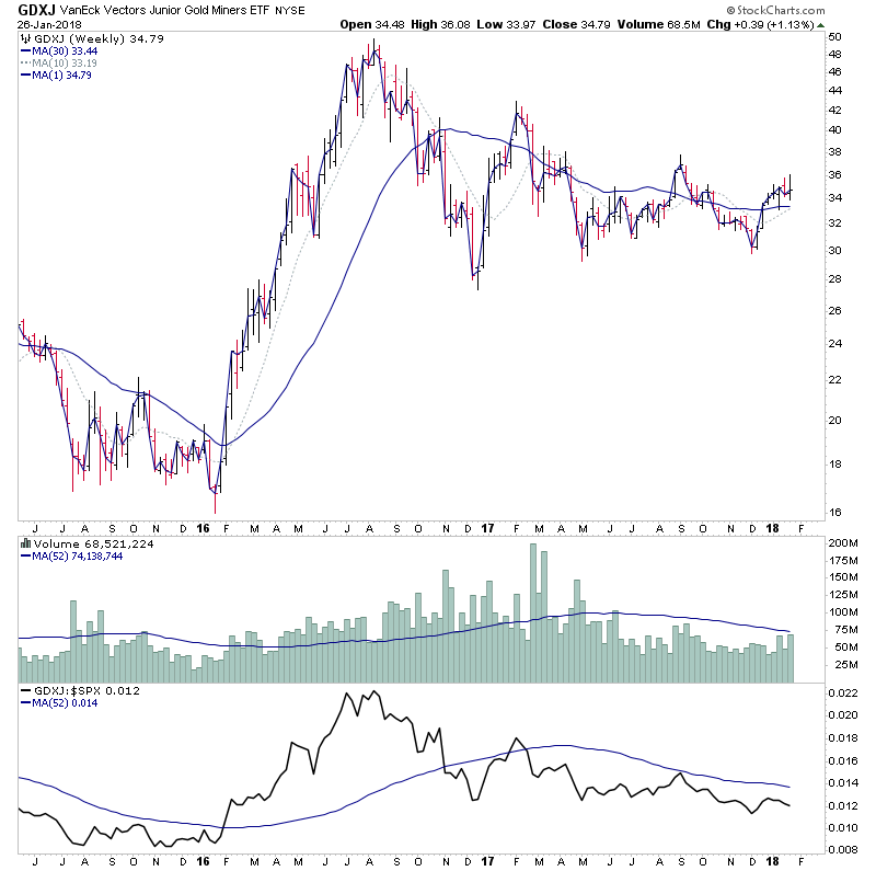 If we do see a new Stage 2 breakout then history suggests that the gold miners are a leveraged way to play it, especially the junior miners, which can have very big moves. So I've gone through the gold miners charts in the US and Canada to look for the stocks getting strong volume increases and that are in good shape for a potential move or already moving.
