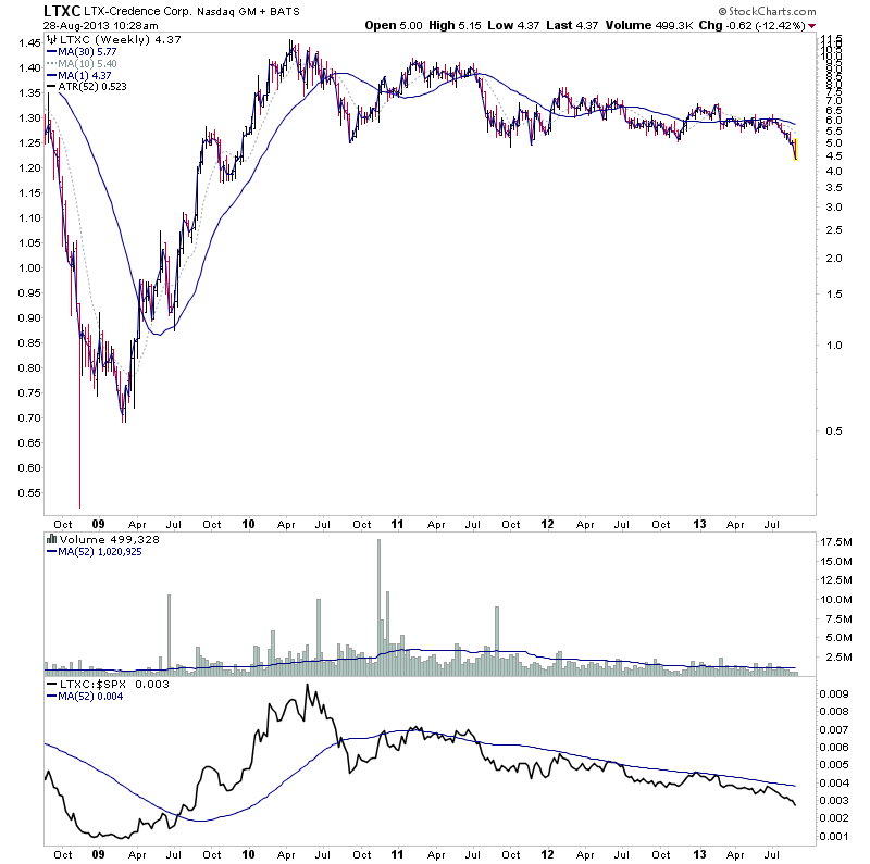 LTXC is in Stage 4A and is breaking down to new 52 week lows. I've included the 5 year chart to give a bit more context on the prices in the past.