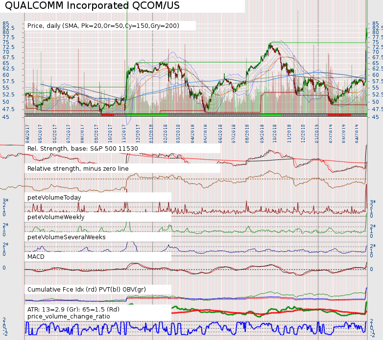 CNBKA, EFII, INTC, KSU, OMC, QCOM.  Subjectively I seem to have more breakouts today than previously.  However, not all charts are of a form I would think was useful.