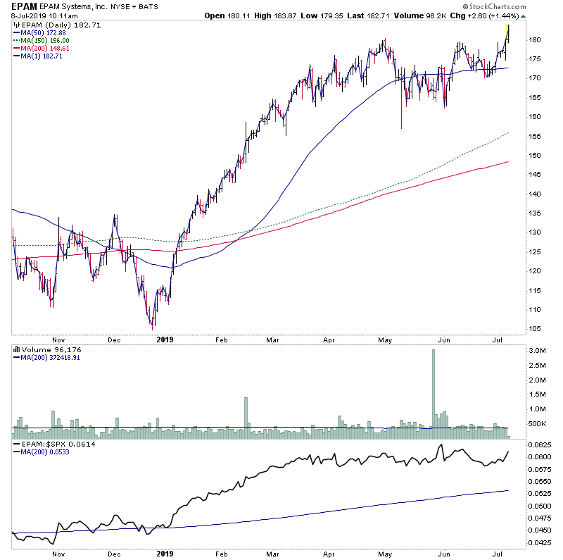 EPAM - showing strong relative strength to breakout to new highs in the early trade in a down market. Lacking volume though.