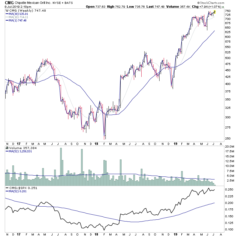 CMG - on the move to new highs as well today from a volatility contraction. Again lacking volume though on this breakout move.