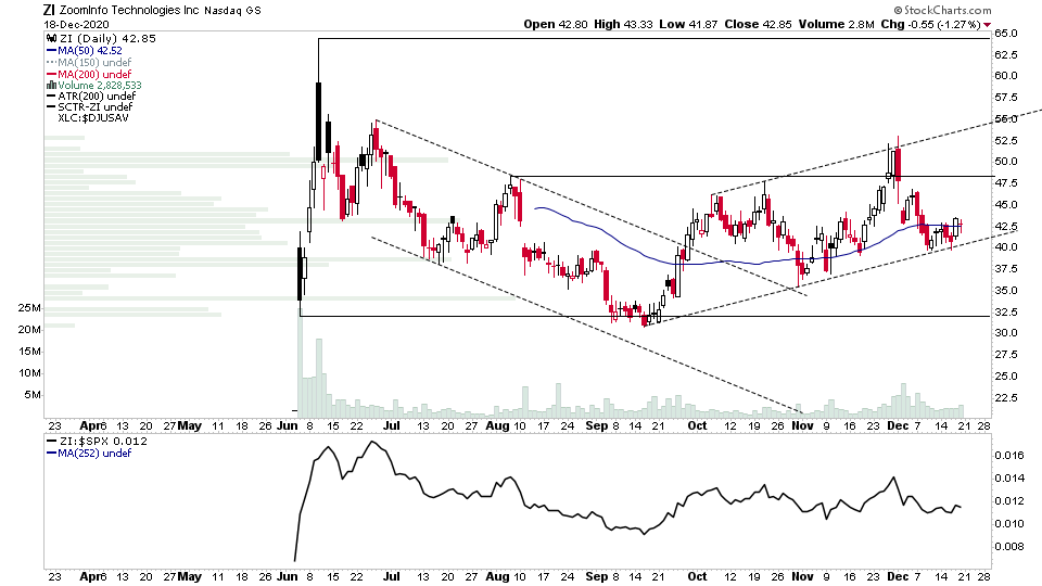 (2020-11-21, 06:54 PM)isatrader Wrote: $ZI recent IPO developing a primary Stage 1 base with some contraction in volatility. Watching for a breakout above 48 on strong relative volume