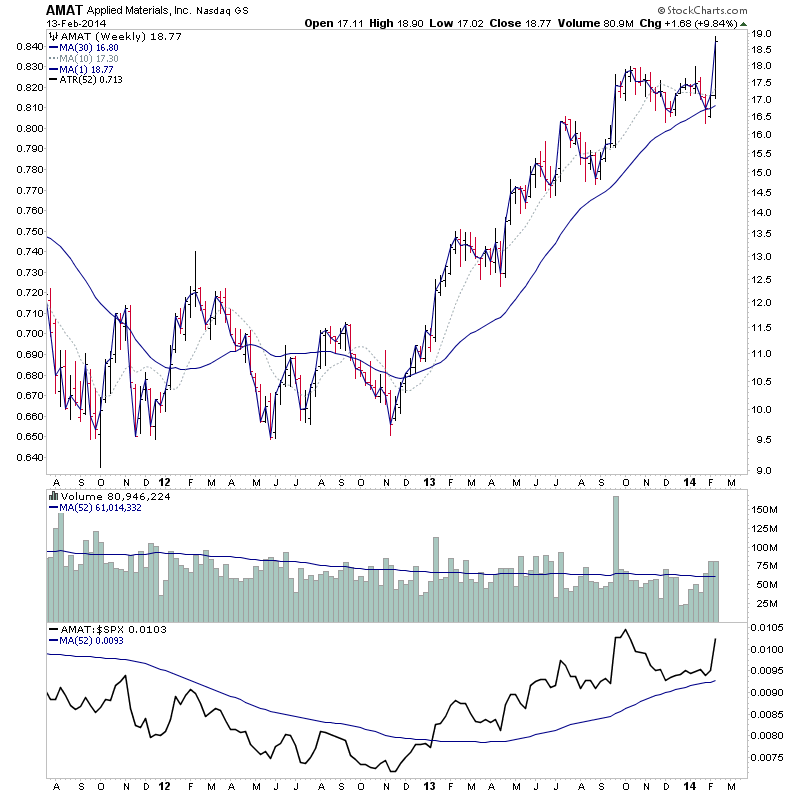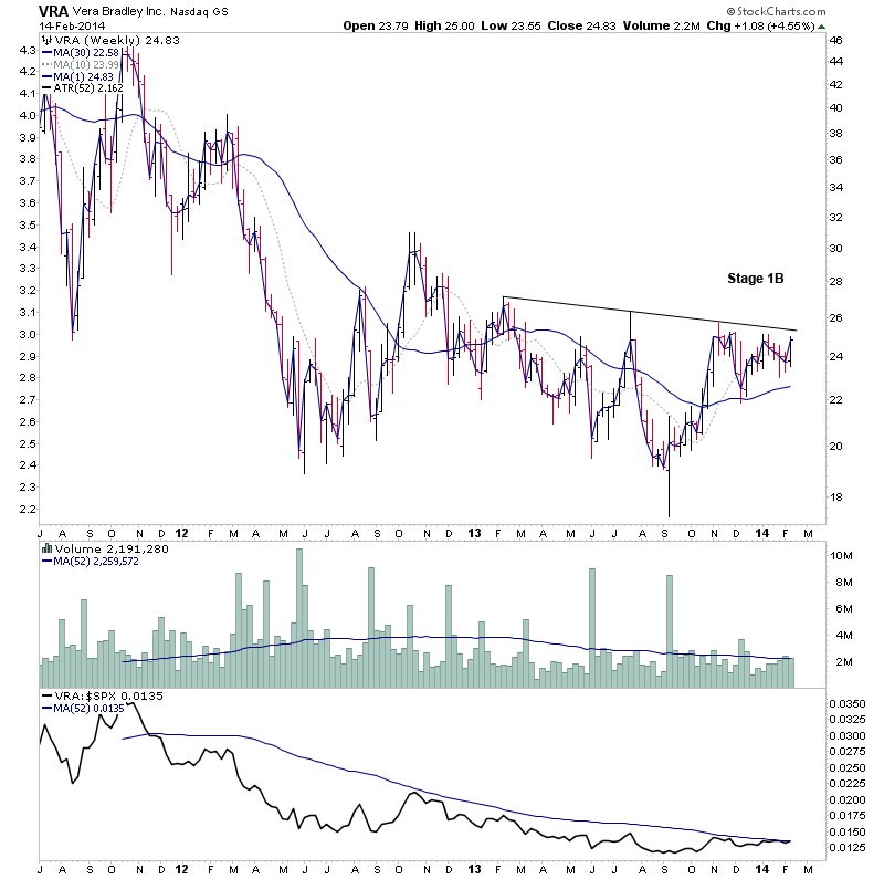 ZNGA has come up a few times before, but has been struggling to advance since it's initial weak Stage 2A breakout in late September. Since then it broke out and fell back into the range again, and so has formed a broader Stage 1 range imo, and so this week it's made another attempt to clear the base and made it, although the weekly close wasn't very strong and volume failed to meet the 2x requirement, although there's been a significant increase in the last three weeks from the previous few months which is a good sign that it's getting some interest. So a tentative Stage 2A imo.