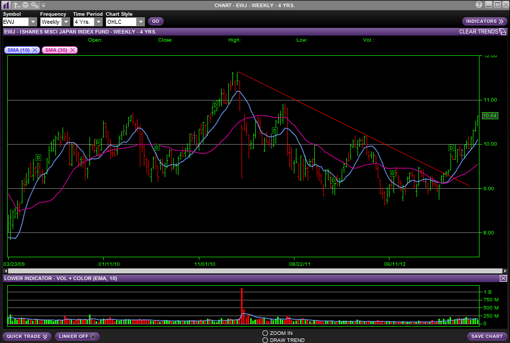 iShares Japan ETF (EWJ). Moving on some very high volume, EWJ has broken out already but has not traveled too far (price wise) imo. It still has a couple of levels of overhead resistance left to tackle (10.94,11.65), but the volume (obviously linked to the big yen move), is a strong enough signal to me. I might buy this one for the investor method and watch it play out.