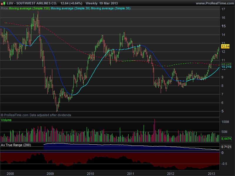 The U.S. airline industry is looking strong to me for 3 reasons. Technicals, fundamentals (oops, bad word), and CNBC hype. Obviously this site is about stage analysis so I will stick to that. I see a lot of breakouts in individual stock as well as etf/index charts. I do see a lack of volume overall and several are overextended and due for a pullback.. Here are a few charts-