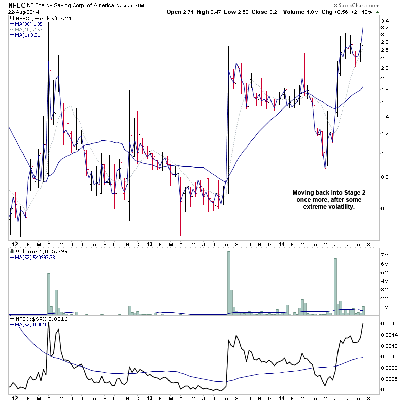 NFEC - Moving back into Stage 2 once more on the weekly chart, after some extreme volatility earlier in the year. The monthly chart is interesting, as shows a two year Stage 1 base developing, which it's now testing the top of, and some interesting volume action. Watching for a monthly Stage 2A breakout to new multi year highs.