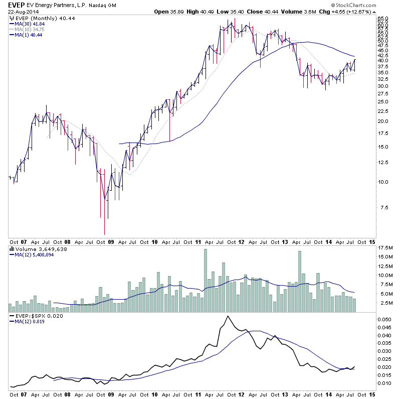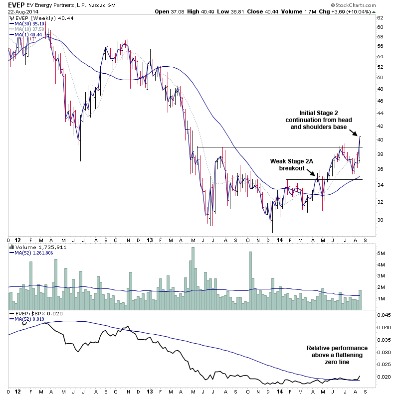 EVEP - Highlighted on 19th as it first broke above resistance. An initial Stage 2 continuation from head and shoulders base, after an initial weak volume Stage 2A breakout earlier in the year. Relative performance has moved above a flattening zero line to new highs also and weekly volume was a little under the 2x weekly average volume that we look for, but it was an improvement on the last few months. The monthly chart is also close to the 30 month MA, which we'd look for a close above by the end of the month for further confirmation of the Stage 2 continuation breakout.
