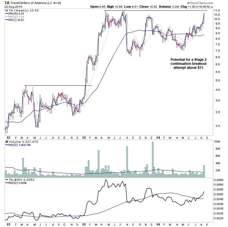TA - Potential for a Stage 2 continuation breakout attempt above $11, with a strong volume move towards the top of the Stage 3 range this week. If you scale out to the monthly chart, you'll see a three year cup and handle pattern, that's formed above a rising 30 month MA.