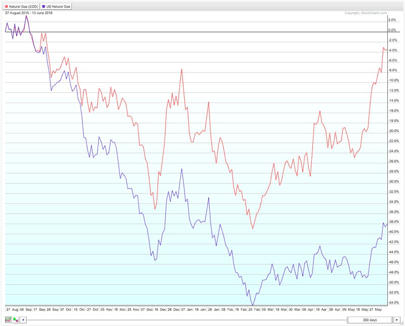 Be careful with trading Oil or Gas ETFs as they suffer from contango, which causes the spreads of the ETFs to dramatially underperform the actual spot price over the medium to long term (see attched), and so you can end up losing even when the spot is rising. For example, the natural gas spot price over the last 200 days has fallen and then recovered to only down 4%, but the UNG ETF is still down 38%!!!! Wherea spot oil is currently up almost 14% in the last 200 days, whereas the USO ETF that tracks it for retail investors is down 15%!!! Which I think highlights the problem with energy ETFs. The better way to play them imo, is via stocks in the oil and gas sector instead which don't have these problems.