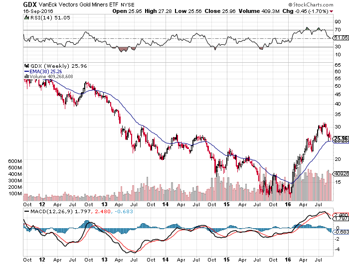 The GDX chart on the weekly is right on the 30 EMA but the EMA is flat and it looks like GDX is about to take a big cliff dive. Can someone please clarify whether this is just a normal pullback to 30 EMA in a bull run or something to be worried about.