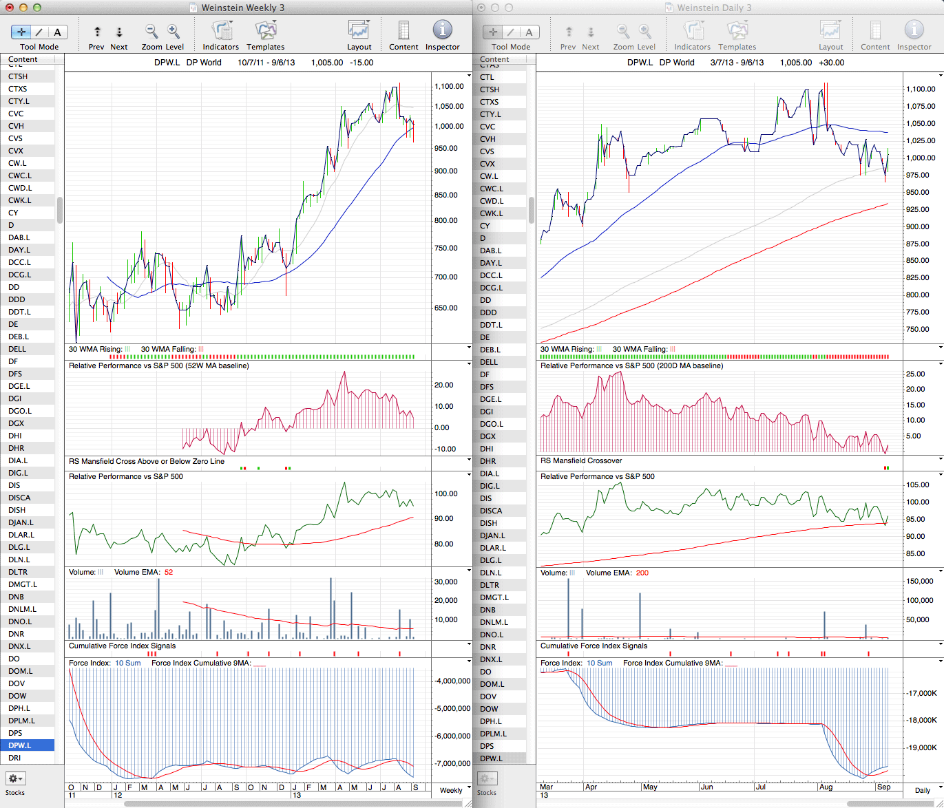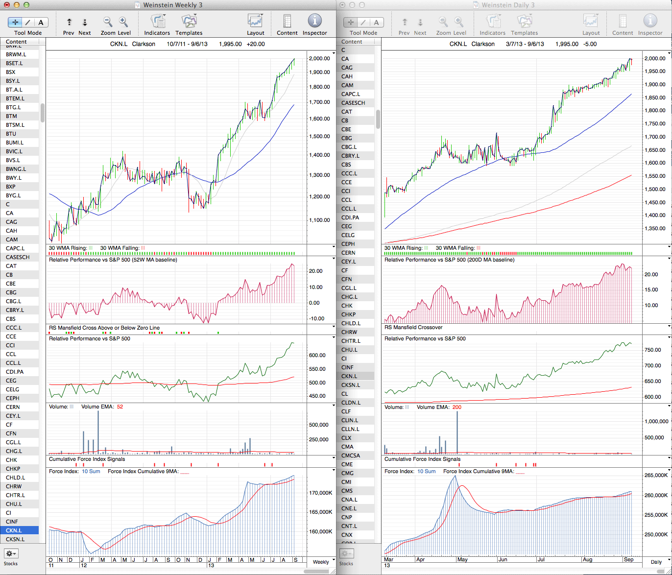 As we are discussing the Marine Transportation sector in the US, I thought it would be good to have a look at the Industrial Transportation sector in the UK (NMX2770) as well, as we have a number of UK based investors on the site including myself. The sector chart has been in a strong Stage 2 advance since the beginning of 2013 and is currently near the the top of it's recent range.