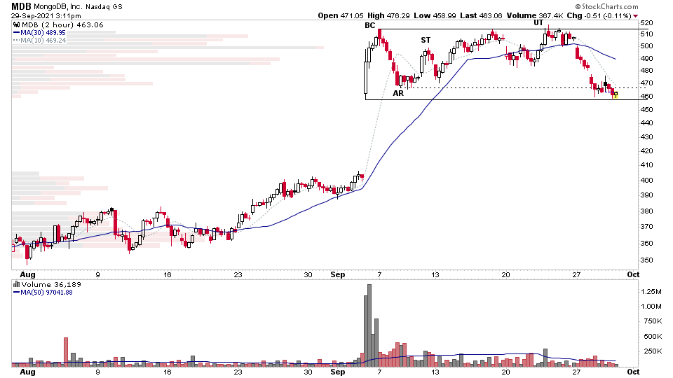 $MDB intraday range may be potentially at Phase C. So watching for any spring type action if the market strengthens. The pullback to the lower end of the range has been on diminishing volume so far
