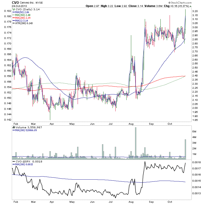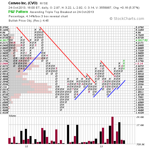 CVO (Cenveo) is close to making it's first continuation move above the December 2012 high, and volume and relative performance look to be making the right moves. Attached is the charts.