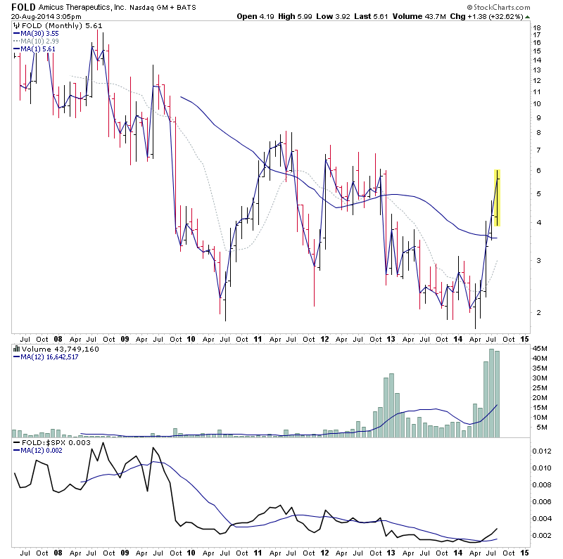 FOLD - is showing up in my scans again for the fourth time since I originally highlighted it when it was in Stage 1a t 2.78 in early June. The resistance zone from 2012 has held it up for the last six weeks, but today it's once again making a fresh Stage 2 continuation move on heavy volume. And if you look at the monthly chart you can really see the volume build over the last five months, and potential areas of resistance that could slow it's advance.