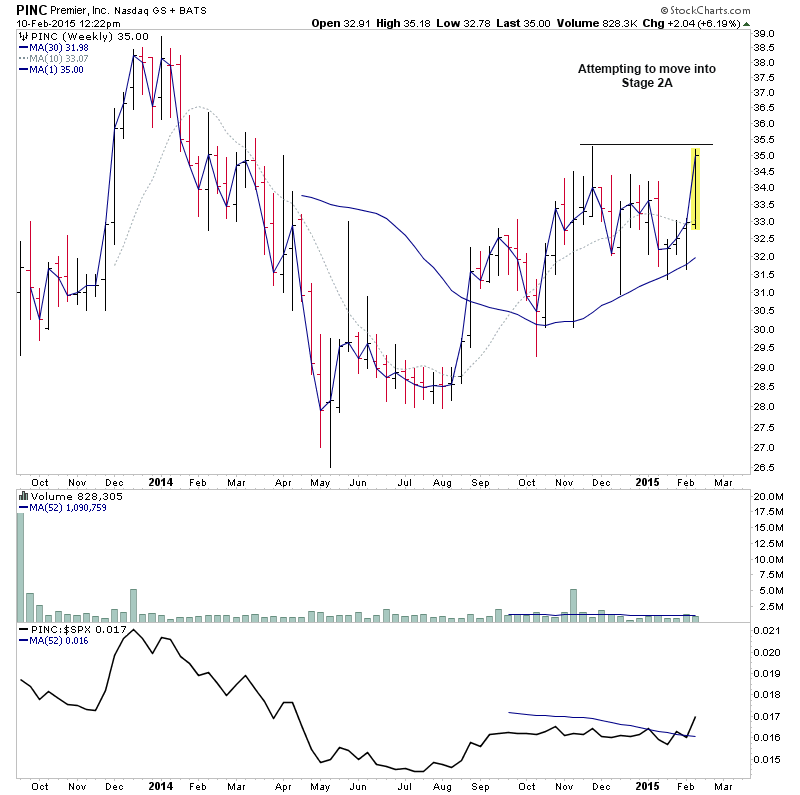 PINC - Potential to make a Stage 2A breakout this week from it's primary base since the IPO. Gap up on increased volume today.