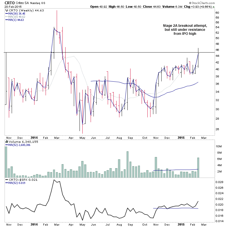 CRTO - Stage 2A breakout attempt on 2.36x the weekly average volume, but still under resistance from IPO high
