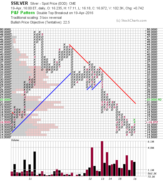 Note: the P&F chart has made it's first double top breakout since 2011, and the initial P&F price objective is at $22.5 currently, but it won't be calculated until the next pullback to a column of Os. So it could get bigger if the price doesn't pullback before going higher again. But, major resistance is at $27 from the 2011 lows.