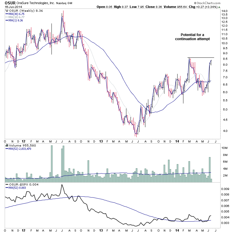 KFS - attempting a Stage 2 continuation from high tight flag. Thin stock, strong relative performance.