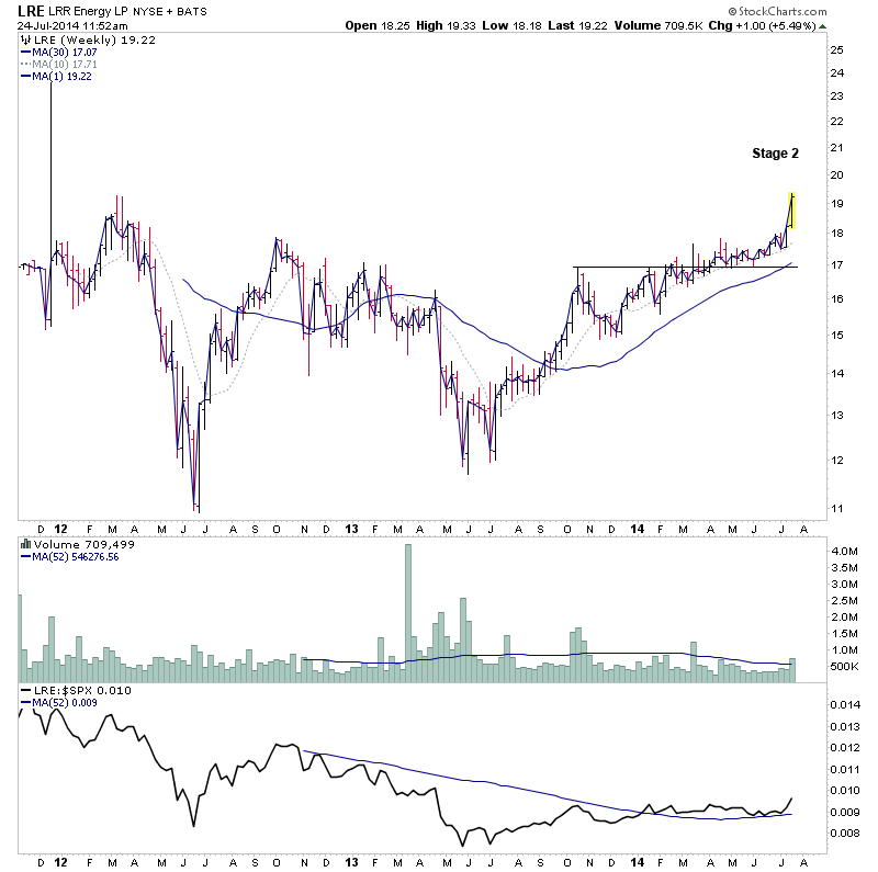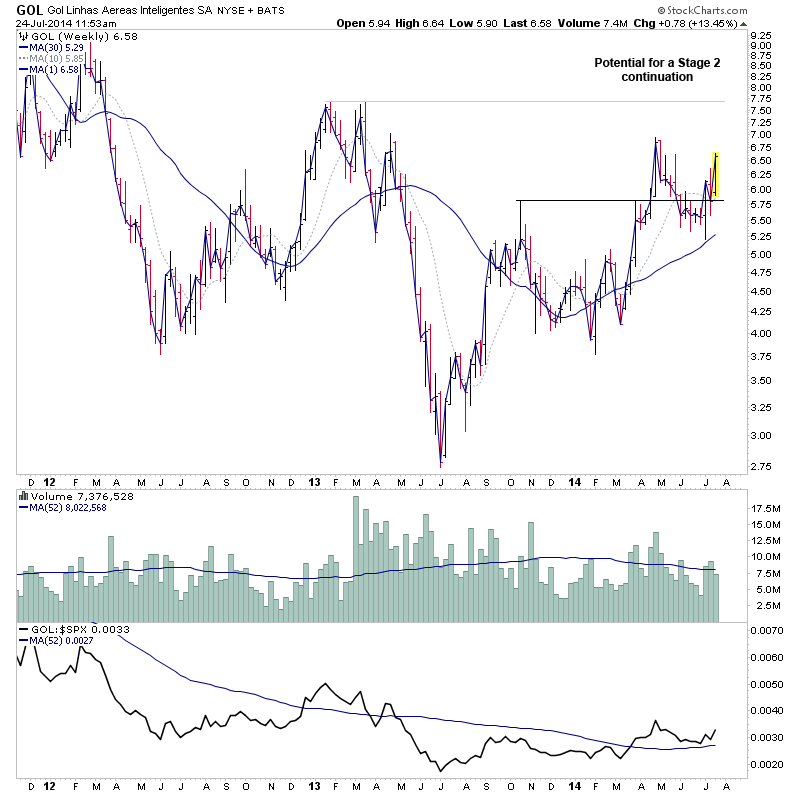 It managed to close the week above the breakout level and 2013 highs on just over 2x the weekly average volume, and so made a Stage 2A breakout and looks to have the main ingredients we look for. i.e strong weekly close above the breakout level; at least 2x average volume on the Stage 2A breakout; relative performance versus the S&P 500 above a flattening or rising zero line, and no near term resistance to deal with.