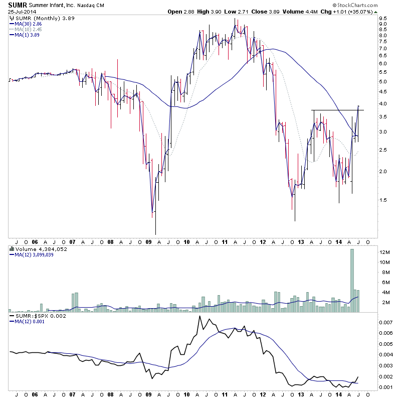 SCOK was brought to my attention by goodtyneguy, and is currently four weeks into early Stage 2A with a significant increase in the volume since moving into Stage 2. Relative performance is also strengthening above a flattening zero line and it's just cleared the 2013 highs and so has no near term resistance. The monthly chart is also showing promise as it has moved strongly above the 30 month MA on more than 6x the average monthly volume, and it's the highest volume for over three years. So the monthly is showing the positive progression that we want to see and the monthly chart is now in Stage 1A itself.