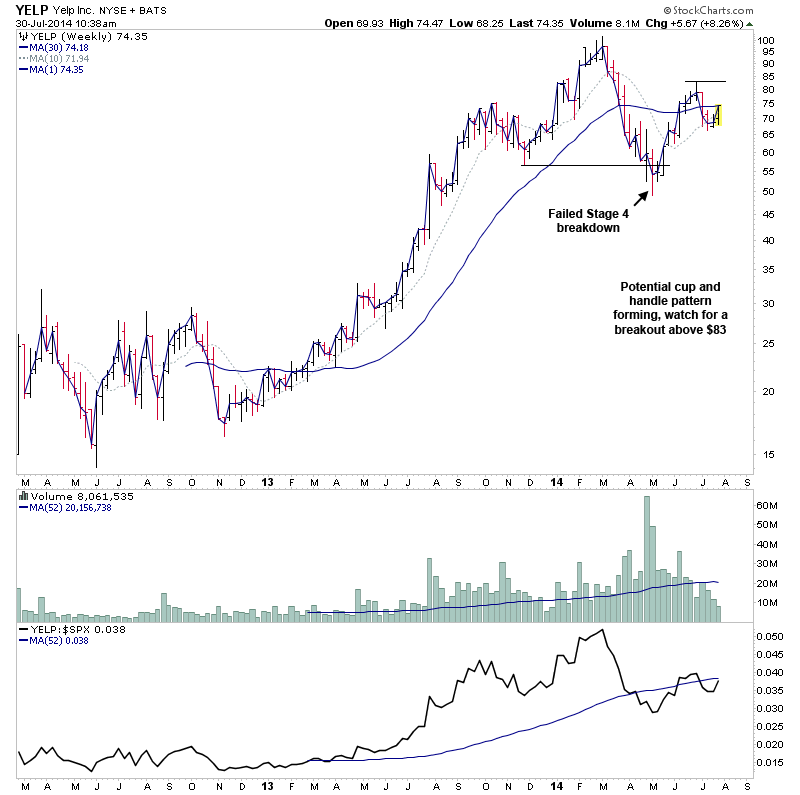 YELP - following it's failed Stage 4 breakdown attempt back in April/May, it's now forming a potential cup and handle pattern, so watch for a breakout above $83 for a possible Stage 2 continuation.