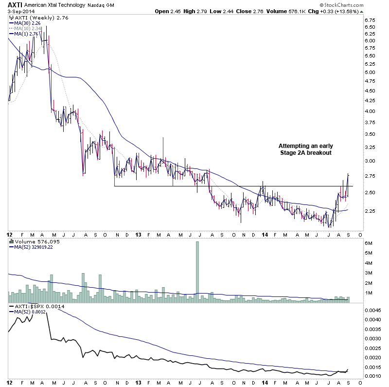 A number of stocks for the watchlist tonight as I've not been around today, so I'll split them into a few posts - Stage 2A breakout attempts in AXTI, MAGS