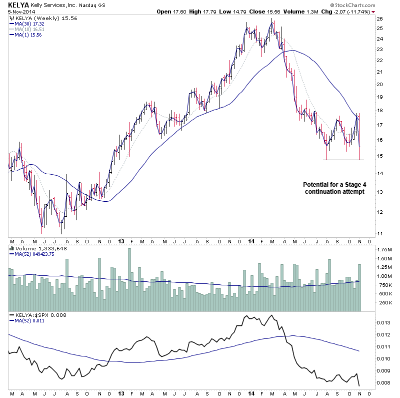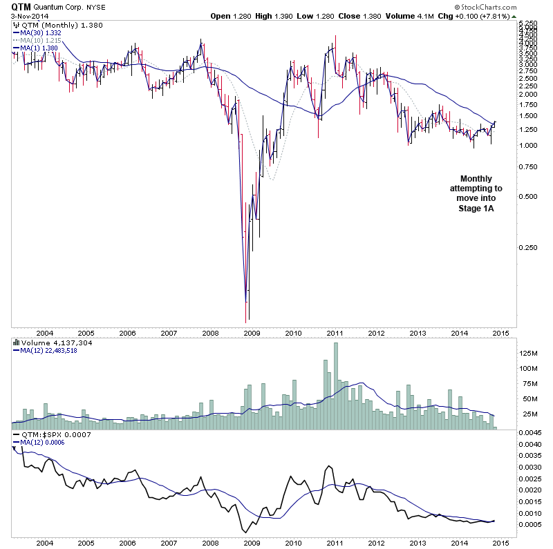 The monthly chart is also recovering and attempting to move into early Stage 1A above the declining 30 month MA.