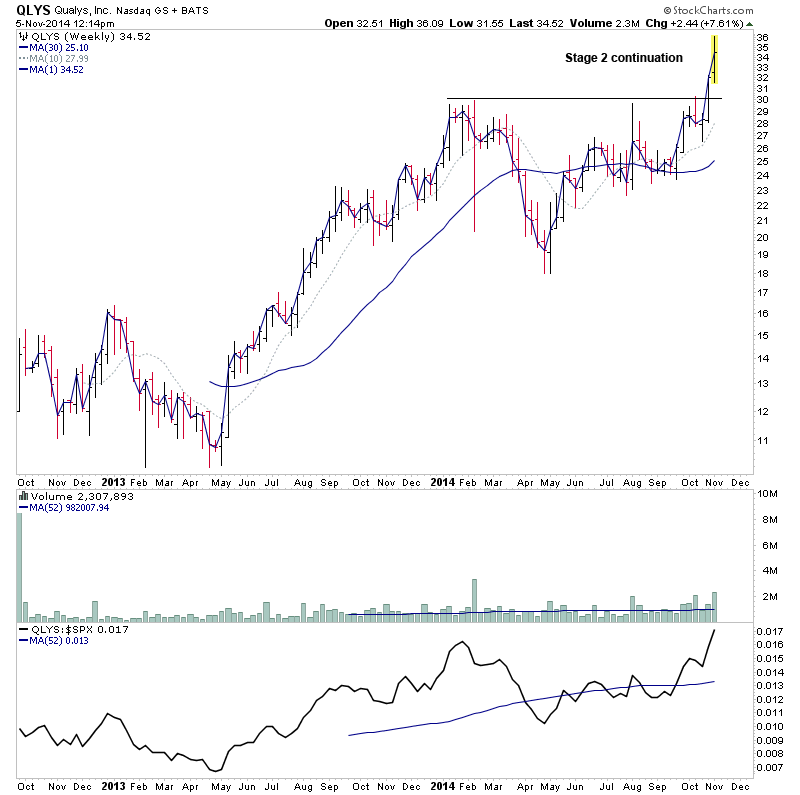 QTM - A minnow attempting to make an early Stage 2A breakout, with near term resistance still. It did almost a whole weeks average volume on the first trading day of the week and Relative performance has broken above the flattening zero line this week.