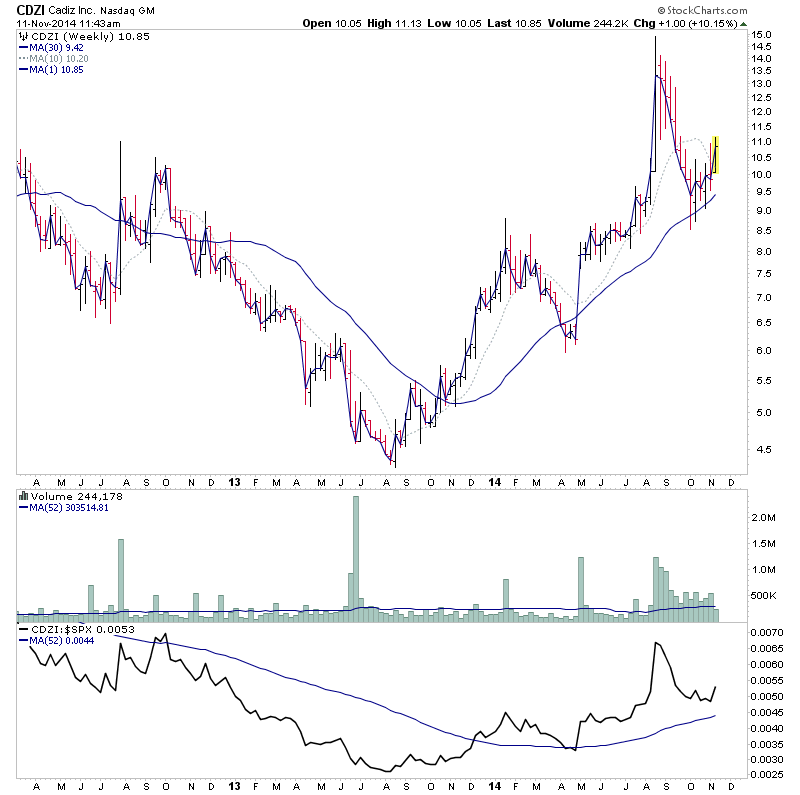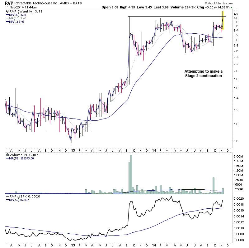 Here's the charts. Attempting to move into Stage 2A on the weekly above it's recent swing high. Still near term resistance from the 2013 highs, but strong relative performance above it's zero line.
