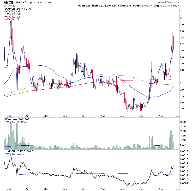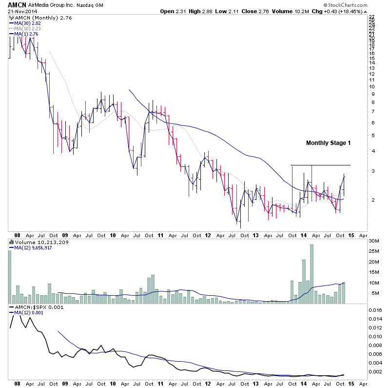 AMCN - Stage 2A breakout on strong relative volume, within a longer term monthly Stage 1 base. Highlighted earlier in the week on Wednesday 19th Nov in the Elite Board.