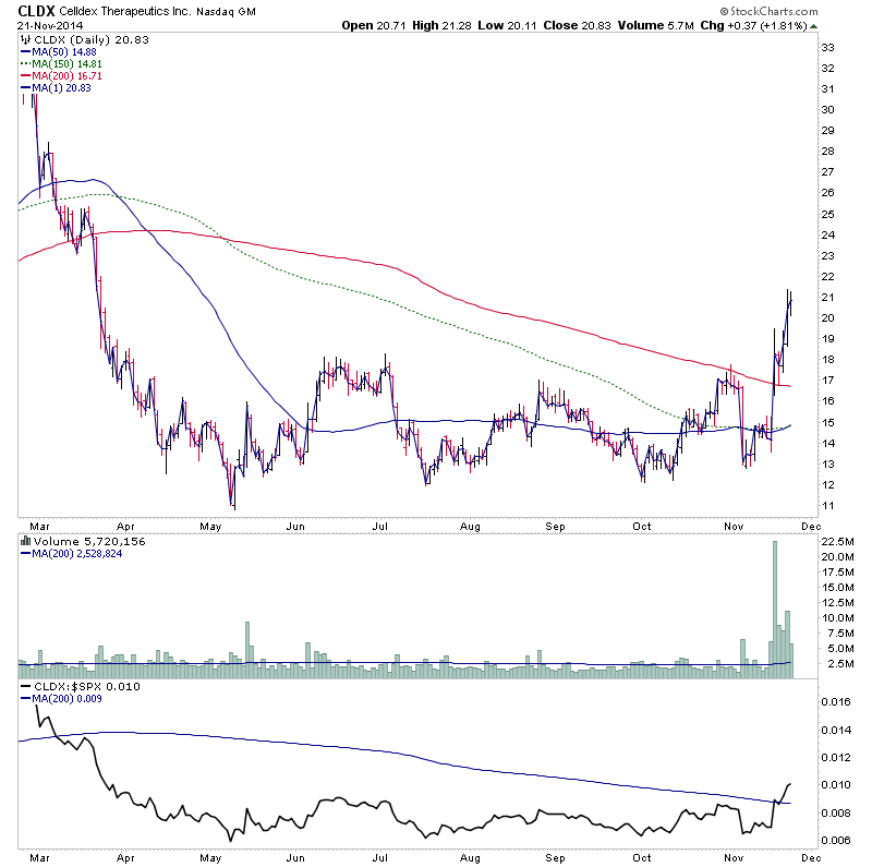 CLDX - Stage 2A breakout into resistance, strong relative volume and improving RS. The main problem with this is that it's got significant overhead resistance to get through due to it's early breakout. However, the heavy volume is what it will need to do it, so possibility it will make it, as if you look at the monthly chart it's the strongest ever monthly volume.
