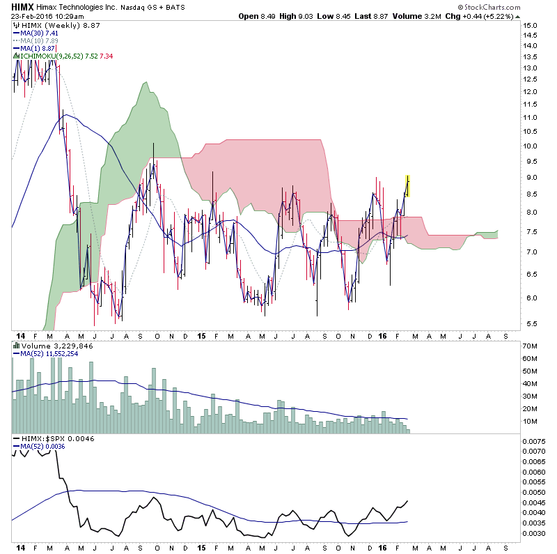 HIMX - Stage 1B with a big two year base. Potential for a Stage 2A breakout attempt, and relative performance vs the S&P 500 is at 52 week highs above a rising zero line.