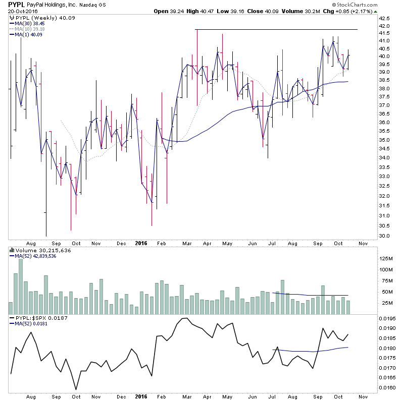 Fate does not always let you fix the tuition fee. She delivers the educational wallop and presents her own bill - Reminiscences of a Stock Operator. RE: US Stocks - Watchlist and DiscussionPYPL - Up to $41.78 in the after hours trade following earnings. So potential for this to finally breakout out of it's IPO base and into Stage 2. $42.55 was the IPO high in 2015 and the 2016 high was $41.75