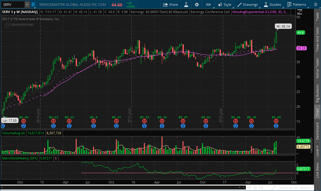 Here's one I found - SERV - looked for sector chart with early breakout then combed through the tickers. note there were not as many stocks listed in this sector, so I put a little less weight to that. But otherwise looks good. Volume followed through, its at a 10 yr high, and RS has been hovering near 0 line and crossed into positive territory.