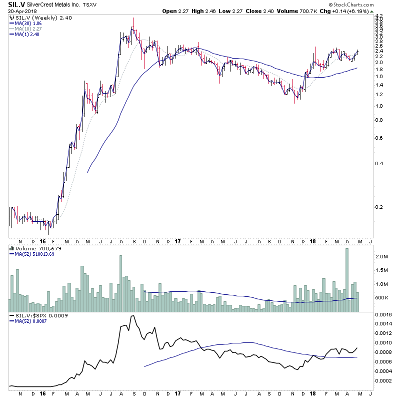 SIL.V is interesting looking chart with a stock that's shown that it can really move from it's previous Stage 2 advance and has now formed a volatility contraction pattern and approaches the breakout level with a volume surge today. Am watching the 2.55 level