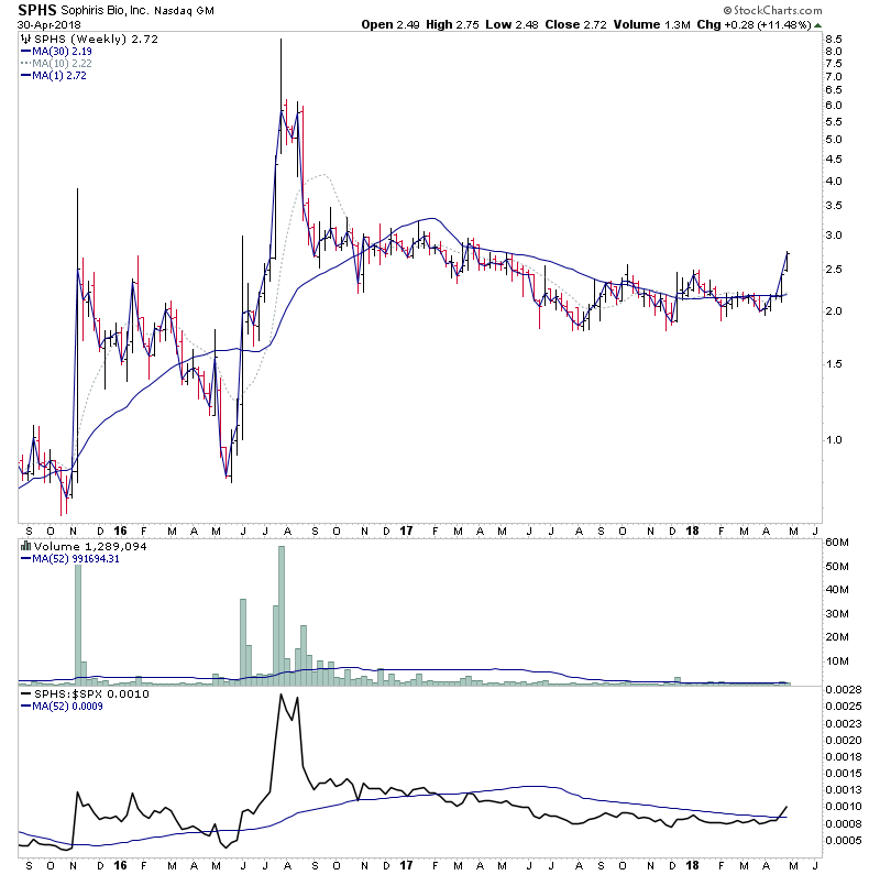 SPHS is making a Stage 2A breakout attempt today. The weekly volume is already above it's one year average volume today, so I would assume that by the end of the week it will make the two times requirement (if the breakout holds) that we look for as it still four more trading days.