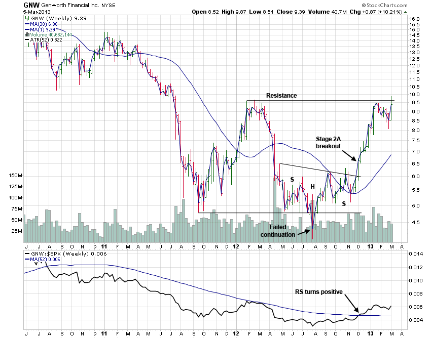 So I just wanted to highlight that for you, so that you don't miss some of early Stage 2A stocks when you are doing your visual scans of the charts. Smile But for the trader method, where you've identified is ideal, if it makes a continuation move. As people using the trader method should do something like 80% of their buying on continuation moves of stocks already in Stage 2, with a strongly rising 30 week MA and good relative performance since the initial Stage 2 breakout.