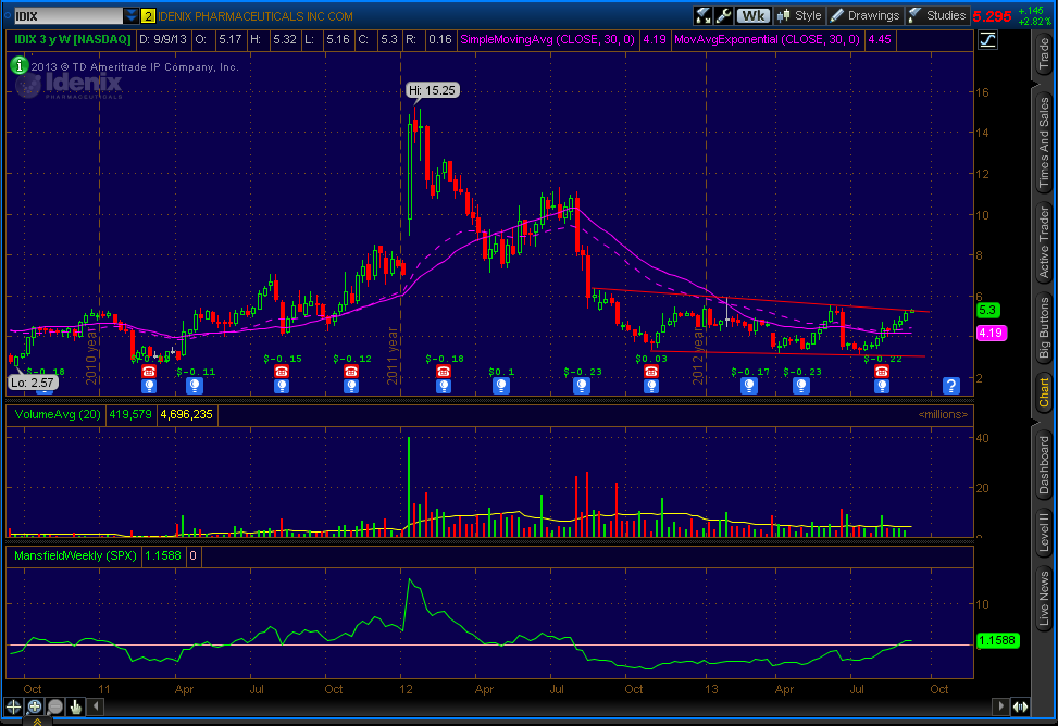 IDIX looks like it peeked above resistance today. Not much volume to speak of yet. I am considering a buy stop at 5.51. Only problem is setting an initial sell stop so will need to go with the 4-6% rule.