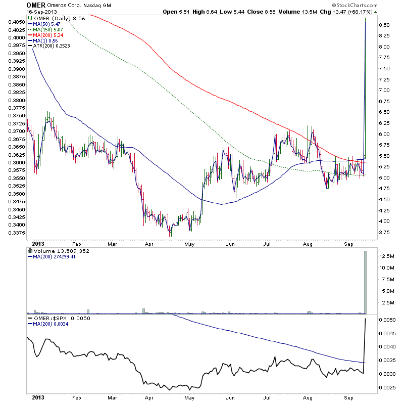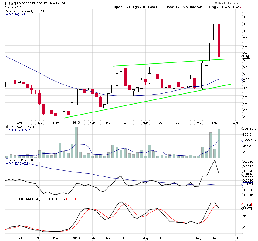 (2013-09-15, 07:09 PM)theory6453 Wrote: Not for the faint at heart, but PRGN had a MASSIVE pullback this past week but held against the breakout/support we identified recently. If I'm not mistaken, this is EXACTLY the setup that Stan put forth in the Investor method. The volume is very strong and the MA is still rising. The relative performance obviously took a major move downwards but it's still above the zero line.
