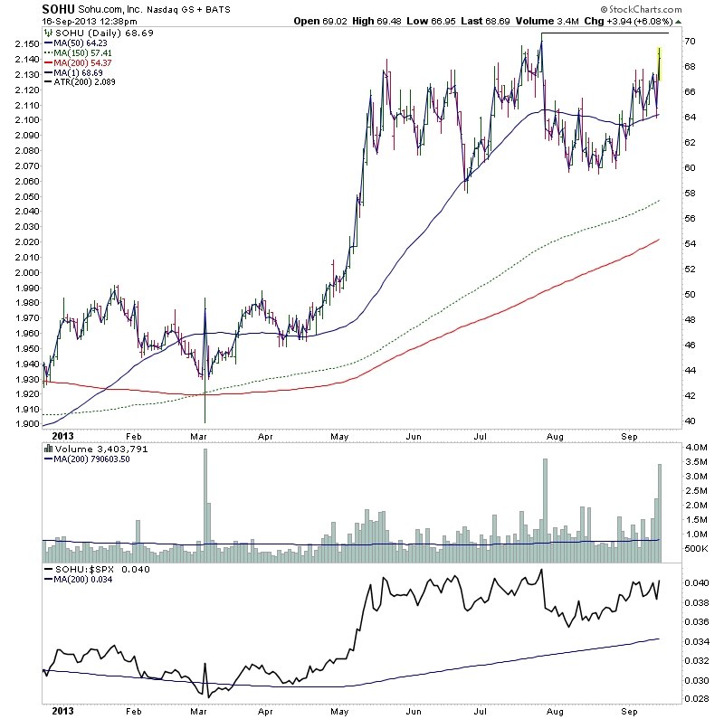I came across SOHU today, which is in the internet sector near the top of a four month consolidation pattern in Stage 2. Relative performance is good and it's already done it's average weekly volume so far today. So is one for the watchlist imo for a possible Stage 2 continuation move above the July swing high. Attached are my charts.