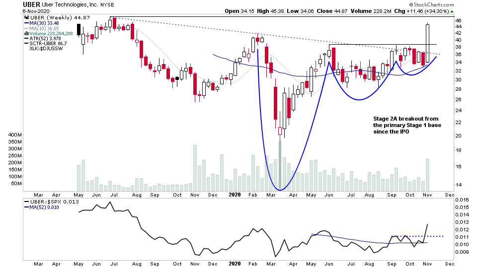 With $UBER breaking out into Stage 2 this week, it's important to look at what other stocks in its group are doing to help confirm the move. $LYFT is the main competitor & is currently forming a Stage 1 base, but got its highest ever volume this week as it put in a higher low. So that's a positive for the UBER breakout, as shows there's institutional interest in the group, and UBER is the emerging leading stock of the group.