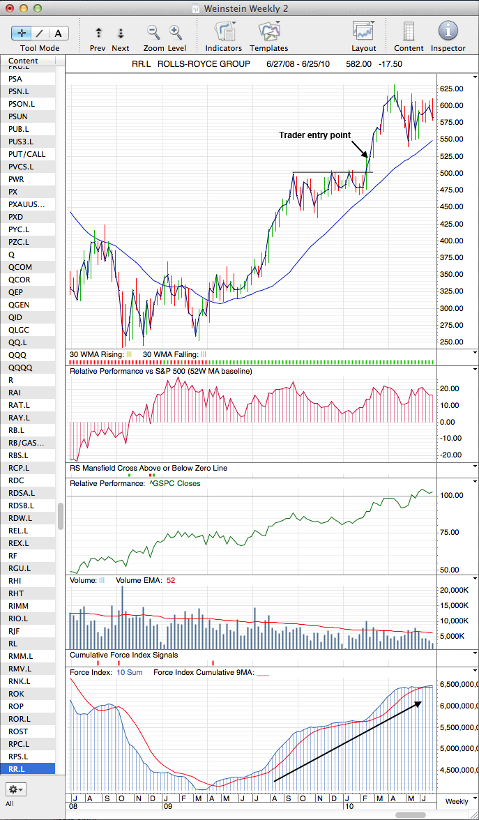 See my below example of Rolls Royce from 2010, and compare to the ideal buy for a trader chart, as I think that's a good example, as it went sideways for 4-5 months before breaking out again, but still within a strong stage 2 uptrend. Following the breakout it made a two month 9 x ATR(200) run, before starting to consolidate again. Remember what is says on page 18 in the book.